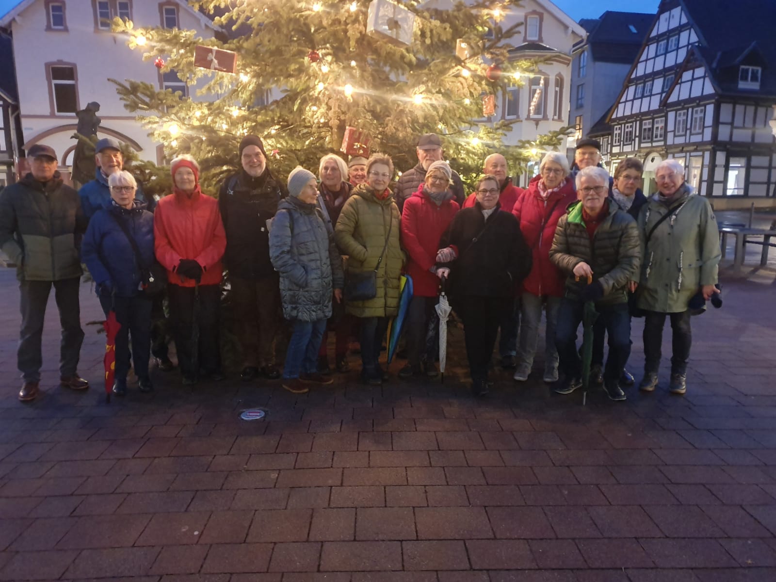 Trotz fast frühlingshafter Temperaturen und gelegentlichem „lippischen Landregen“ waren die aktiven Mitglieder der Wandergruppe des TV Blomberg e.V. fast vollzählig der Einladung ihres Wanderwartes Dieter Lange zum Jahresabschluss in das Sporthaus am Rammbocke gefolgt. Der zum Beginn aufgetischte obligatorischen Kaffee- u. Kuchen sowie die Teilnahme an einer kurzen Wanderung durch die abendlichen Straßen des alten Stadtkerns ihrer Stadt zum Weihnachtsbaum auf dem Marktplatz, waren eine gute Vorbereitung für den Jahresbericht ihres Wanderwartes.